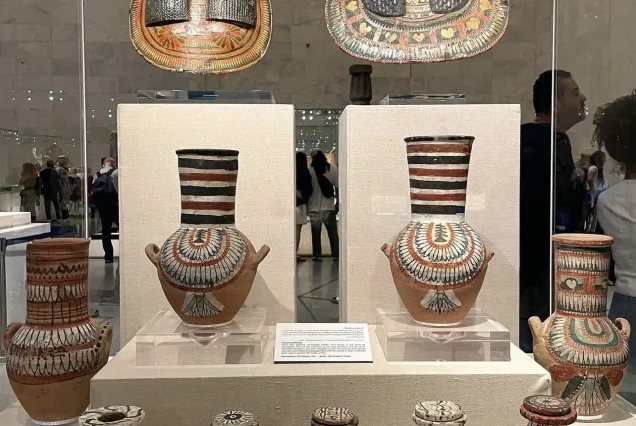 The main Exhibition Hall show the four main crafts that shaped the Egyptian civilization pottery, wood, Textile and ornaments You can see over there the oldest prosthetic toe all over the world, the skeleton of a man dates back to 30000 years ago, the Kaaba Cover (kiswaa Al kaaba) which was the last one made in Egypt during the time of president Naser and the Mahmal which it used to carry the cover from Egypt to saudia Arabia every year in a great parade